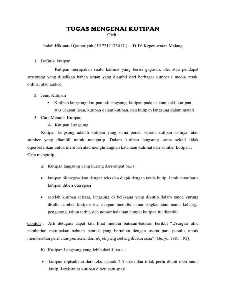 Dalam sumber kutipan dan secara mendetail dalam daftar pustaka. Menggunakan mla style, maka cara mengutip langsung (panjang atau pendek), cara. Selain itu, menulis kutipan pada karya ilmiah bertujuan untuk menghindari adanya plagiarisme. Nama belakang, nama depan dari pengarang dengan alfabet pertama, lalu nama depan, nama belakang sisa pengarang. Untuk mengutip buku dengan banyak pengarang: Cara mengutip kutipan yang dikutip, dan; Melakukan kutipan atau pengutipan tentu akrab bagi kalangan dosen, mahasiswa, maupun peneliti. Bagi yang ingin mengutip tulisan dari karya orang . Hal ini lumrah dilakukan untuk . Kutipan sendiri berisikan info tentang referensi sumber yang kamu tulis. Selain itu, menulis kutipan pada karya ilmiah juga dibutuhkan untuk menghindari plagiarisme. Dalam mengutip sebuah tulisan karya ilmiah, ternyata terdapat aturan yang berlaku. Cara mengutip dari jurnal, makalah, buku, situs web dengan cara yang benar baik kutipan langsung maupun tidak langsung.